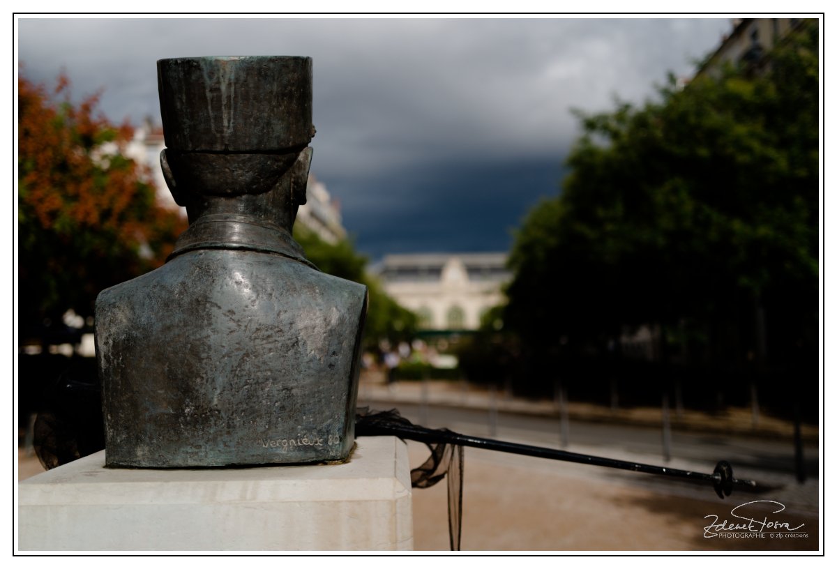 On peut deviner le regard inquiétant de ce buste face au ciel sombre