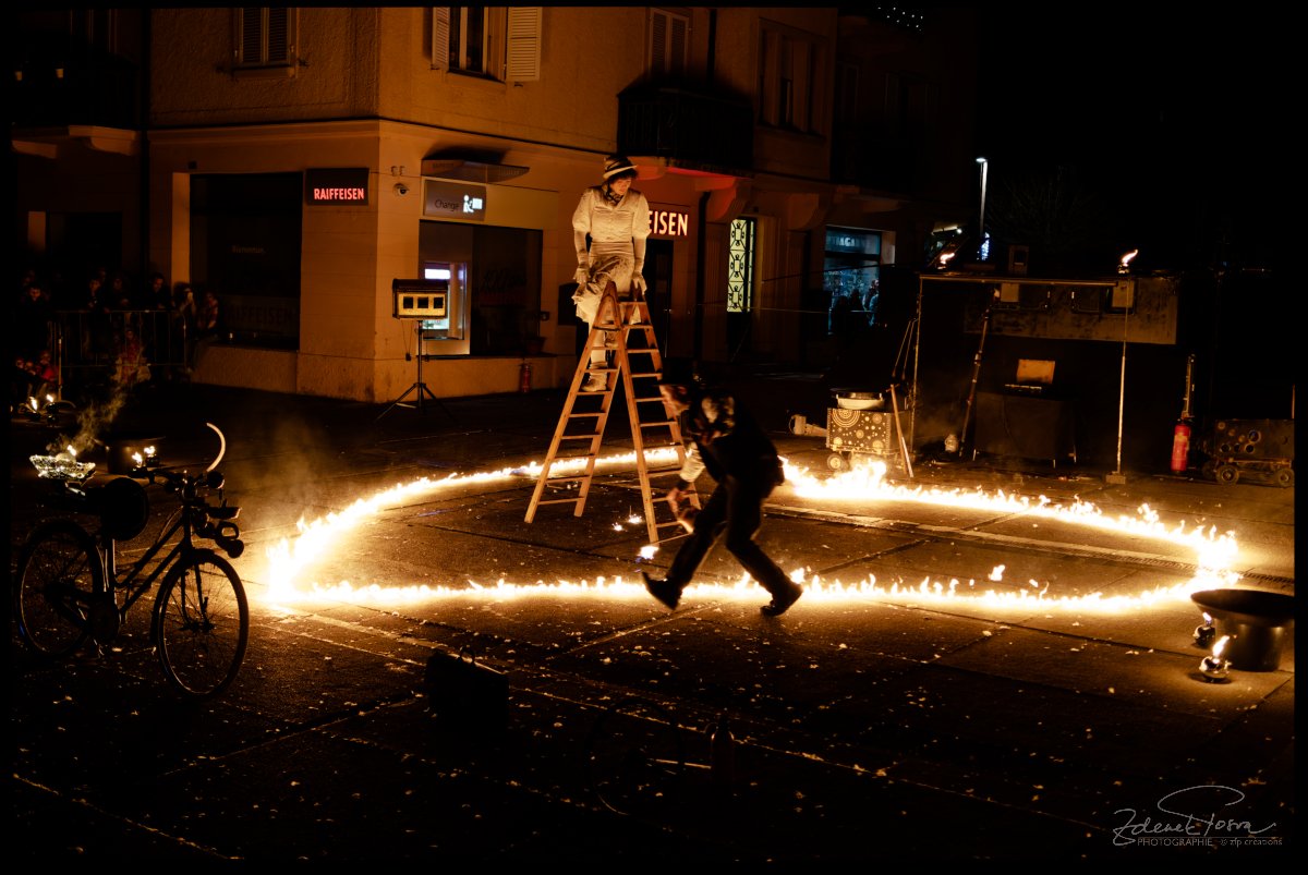 Les deux artistes de la “Compagnie Herz Feuer” jouent en duo ou seuls lors de diverses manifestations dans toute la Suisse et dans les pays limitrophes. Leur spécialité est la proximité avec le public et l’alliance du feu et des bulles de savon encore unique en Suisse. Leur spectacle "Glitzer Glanz und Feuertanz" en est une belle illustration.